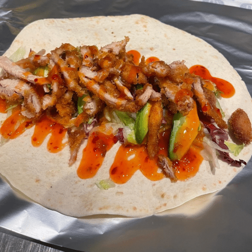 Koreaanse karaage kip gecoat in soy garlic, sla, kimchi en gochujang mayonaise